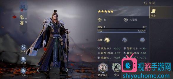 3.郭嘉的兵種屬于騎兵系,克制步兵,被槍兵克制。騎兵比較擅長打開局,攻強(qiáng)守弱,對(duì)于郭嘉而言,輸出能力得到一定提高。