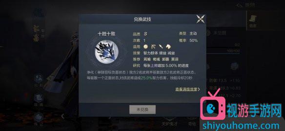 7.郭嘉可兌換的武技為S級(jí)武技“十勝十?dāng) ?一個(gè)十分強(qiáng)大的解控、輸出主動(dòng)技能。“十勝十?dāng) 辈粌H可以解除我方2名武將的負(fù)面狀態(tài),而且可以驅(qū)散敵方2名武將的正面狀態(tài)。同時(shí),每驅(qū)散一個(gè)正面狀態(tài),對(duì)該敵將造成25%(滿級(jí)50%)智力傷害,該傷害上限125%,攻防一體。