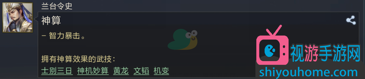 “智爆隊”的武將通常會裝備強力主動技,以主動技作為主要輸出手段。基于主動技豐富的種類,“智爆隊”能廣泛應用于各種情況中。由于智力傷害可以因為“神算”造成雙倍傷害,所以能提高“神算”數值的武技至關重要。基礎智力高的武將,很適合組建“智爆隊”。同樣,將技能點加在“智力”上,對“智爆隊”武將有著相當大的增幅。