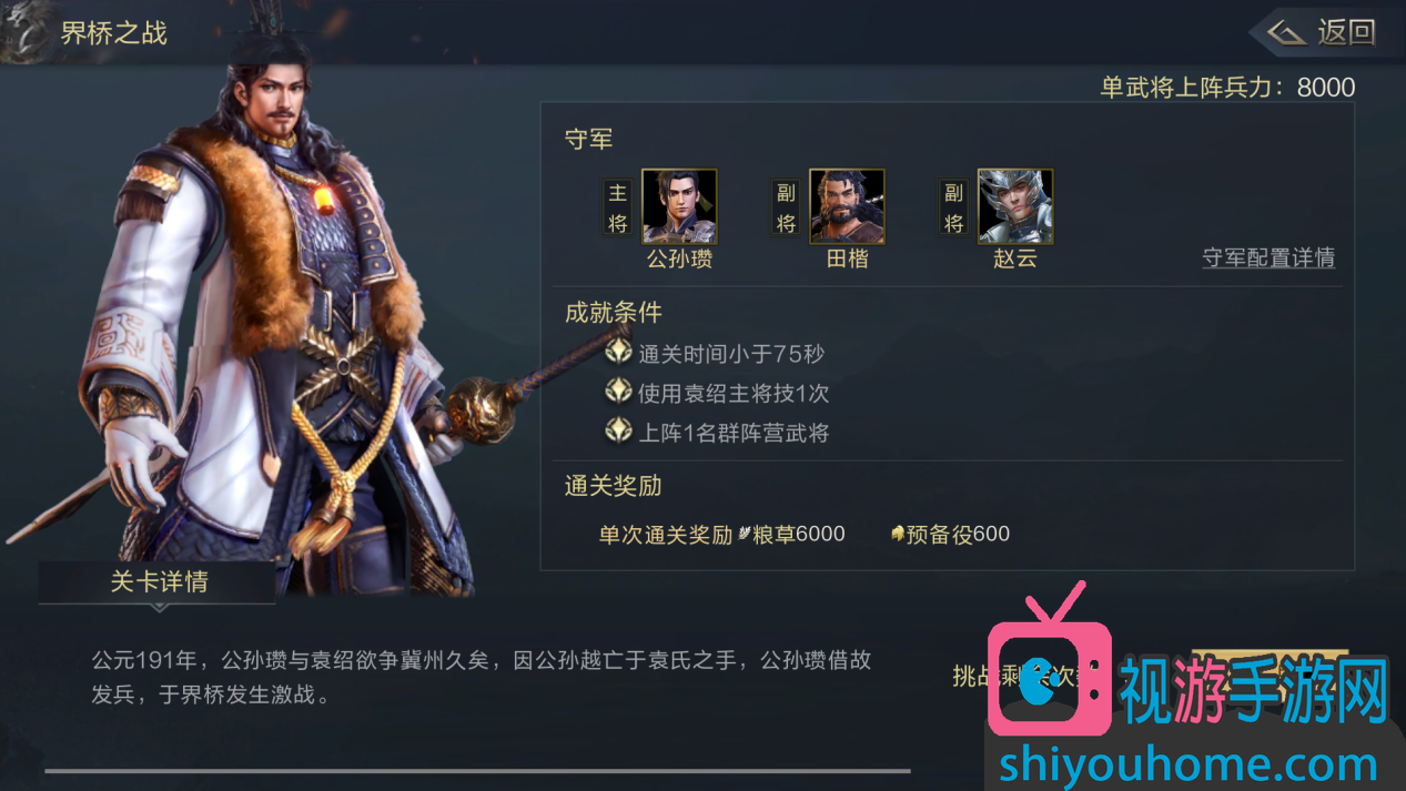 1.通關(guān)時(shí)間少于75秒;2.使用袁紹主將技1次 ;3. 上陣1名群陣營武將