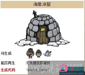 海象冰屋(Walrus Camp)或稱為冰屋(Igloo)是種自然生成且無法摧毀的建筑,會在附近生成下列敵對生物:海象爸爸、小海象、冰獵犬。冰屋被當作是這些生物的基地,并會形成俗稱的“蘇格蘭貴族海象親子狩獵隊”。海象冰屋只會在冬天生成生物。除了沼澤生態環境外,海象冰屋可在其它所有地形上生成。冰屋經常出現在麥斯威爾之門附近,且經常會在附近同時生成兩座以上的冰屋。運作中的海象冰屋每2.5-3天就會重生海象親子狩獵隊。
