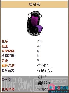 啜食獸這是一種只在廢墟出現(xiàn)的生物,它會(huì)滾向敵人并啃咬目標(biāo),還會(huì)跳起來(lái),張開大嘴整個(gè)包住玩家的頭。不過(guò)有意思的是啜食獸不會(huì)刷新,也就代表在游戲中的啜食獸沒(méi)死掉一個(gè)就永遠(yuǎn)的少掉一個(gè)。啜食獸包住玩家的頭之后會(huì)把自己當(dāng)做裝備到玩家的頭部裝備欄,以每秒1.7點(diǎn)(或者說(shuō)3秒5點(diǎn))的速度消耗玩家的饑餓。啜食獸只要附上玩家,就會(huì)持續(xù)發(fā)出在“啜食”的聲音,同時(shí)吸取寄主的饑餓值,它也因此而得名。啜食獸附在頭上時(shí)會(huì)像礦工帽一樣發(fā)光。沒(méi)有附在角色身上的啜食獸會(huì)發(fā)出和螢光珠一樣強(qiáng)的光,光源是它的螢光珠做的雙眼。
