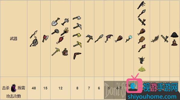 以下為基礎(chǔ)傷害倍率的角色使用各種武器殺死啜食獸所需的攻擊次數(shù)。天候棒不在表內(nèi),因?yàn)樗斐傻膫κ请S機(jī)的。