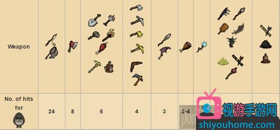 下表是依照玩家的基本傷害,使用每種武器殺死小海象所需要的攻擊次數(shù)。天候棒不包含在里面,因為它攻擊時的反彈是隨機性的。