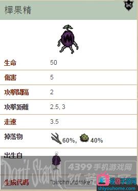 樺果精是又小又圓的小怪物,毒樺樹會(huì)一次召喚出大量的樺果精來協(xié)助攻擊毒樺樹的攻擊目標(biāo)。樺果精會(huì)跳向目標(biāo),并且造成 5 點(diǎn)傷害。大量的樺果精加上毒樺樹本身的樹根攻擊,讓玩家很難去成功消滅(砍斷)它們。但是單一樺果精的攻擊十分容易閃躲并且很容易殺死。樺果精死掉后會(huì)掉落樹枝和白樺堅(jiān)果,是取得白樺堅(jiān)果很好的來源。