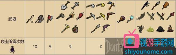 下表是依照玩家的基本傷害,使用每種武器殺死樺果精所需要的攻擊次數(shù)。天候棒不包含在里面,因?yàn)樗魰r(shí)其投射物的隨機(jī)性。