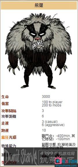 因為熊獾很恐怖,近距離攻擊熊獾幾分鐘就可能會耗盡你的精神值。如果睡覺的熊獾被吵醒,他會打一個大呵欠,屆時,所有附近的生物,包括你和附近的玩家都會睡著(DST)。