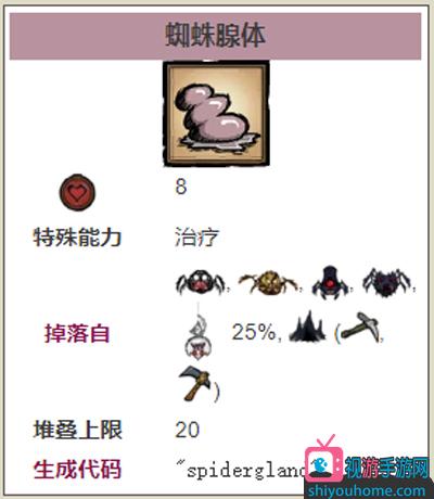 在游戲中,蜘蛛腺體可以通過擊殺各種蜘蛛獲得,蜘蛛一般會(huì)在晚上的時(shí)候出現(xiàn),只有它們被攻擊或巢穴附近的蜘蛛網(wǎng)被踩踏時(shí)才會(huì)在白天出現(xiàn),除了殺死蜘蛛外,玩家還可以通過開采石筍蛛巢來掉落,獲得的蜘蛛腺體能夠?qū)ψ陨砘蚱渌锸褂?每次使用會(huì)恢復(fù)8點(diǎn)生命,并且還可以使用蜘蛛腺體制作治療藥膏。