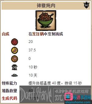 當(dāng)吃下去時(shí),辣椒燉肉能提升玩家的體感溫度 40 度并能持續(xù) 15 秒。