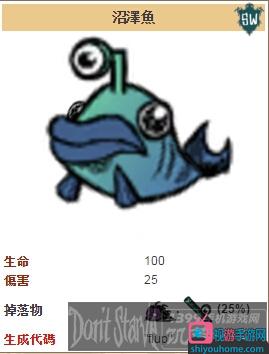 沼澤魚是海難DLC中的一種敵對生物,在沼澤生態(tài)群落生成,等同于原版中的觸手。它們會潛伏在淤泥下方,等到玩家或其他生物接近時再躍起攻擊。如果仔細(xì)觀察的話會發(fā)現(xiàn)沼澤魚伸出地面的一只眼睛,或者泥地上冒出的氣泡。