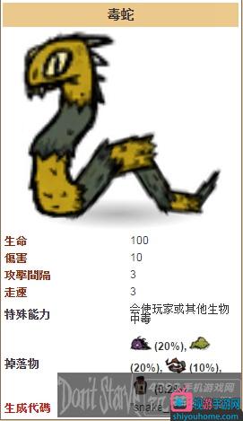 毒蛇是海難DLC中出現的敵對怪物,它們比其他蛇類更危險。被它們咬到的玩家將受到中毒的負面效果。除非使用解毒劑解毒,不然中毒效果會一直存在,并以10秒/-1血量的速度減少玩家的生命值,直到玩家死亡。毒蛇在死亡時有幾率掉落用于制作解毒劑的毒腺。