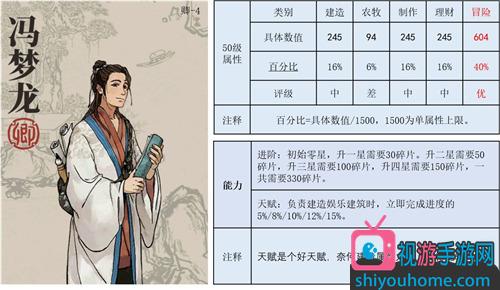 馮夢龍,優級冒險,冒險體力302,其他屬性一般,天賦也雞肋,平常心對待吧。