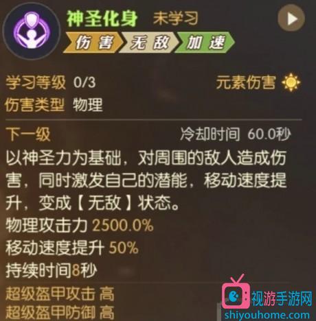 神圣化身:沖陣后,讓自己變為無敵狀態,能將自身的扛傷能力提高到最大化,同時神圣化身還能給予周圍敵人造成高額傷害,在破甲的效果下,能更好的將其攻擊力達到更高。