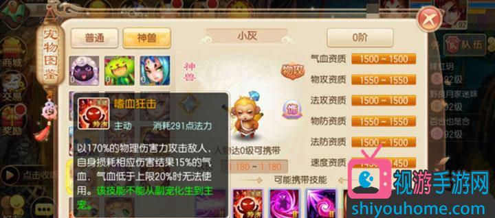 神獸小灰自帶特技“嗜血狂擊”:以170%的物理攻擊傷害力攻擊敵人,自身損耗相應傷害的15%的氣血。此技能雖然與“血性狂暴”提升的傷害量一樣但消耗氣血較少,且使用要求也比“血性狂暴”低,所以小灰在戰場中要比白虎輸出的更容易。