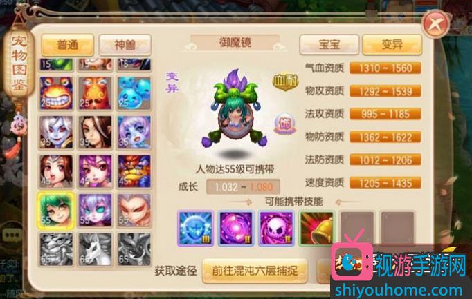 變異御魔鏡的氣血資質和物防資質上限分別達到1560和1622,這兩個數值是所有寵物中最高的,甚至已經超過了魔獸玄武和神獸小灰。