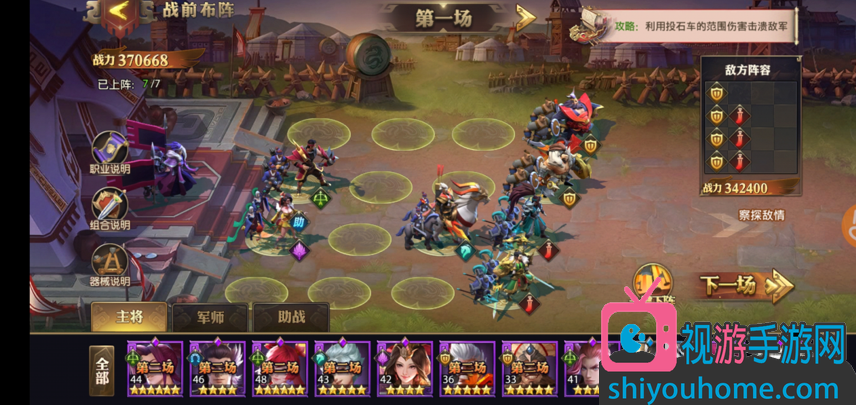 如上圖大家可以看出此一役使用的是L型的站位,關鍵在于頂角要防,而邊角路要攻,敵人的輕騎主將位于下路,因此要把頂角瞄準敵人是這個玩法的關鍵,而剩下的邊角路用風箏拉扯打傷害就可以了,其次頂角盾兵小編是不提議選擇兀突骨的,就像敵人沒1個攻擊、攻擊速度流,所以不僅反傷會沒有了用武之地,相反還會被呂布的嗜血所克到。