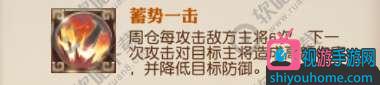 主將4級(jí)時(shí)效果:周倉對(duì)敵方主將攻擊6次,下一次攻擊對(duì)目標(biāo)主將造成354%攻擊+1840的傷害,并降低20%防御,持續(xù)5秒。