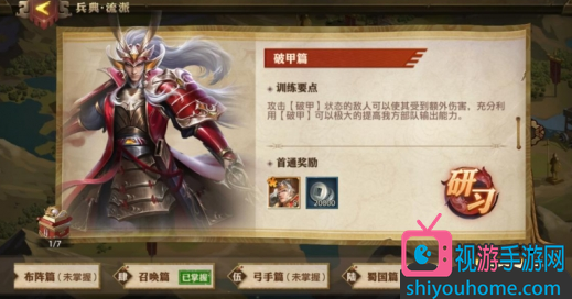 進入游戲首頁,點擊【演武場】,選擇【流派兵典】,拉到最右邊,會看到一個帥氣的軍師周瑜,不僅為玩家點出了破甲流的訓練要點,還準備了豐厚的獎勵,張角碎片5個和銀幣若干,點擊【研習】。