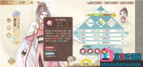 三技能桃夭舞婆娑,攻擊單個目標并造成320%傷害,且有75%幾率使目標防御降低2回合,并使自身有35%幾率閃避提升1回合,滿技能后閃避觸發幾率增加15%,技能傷害增加60%,同時減少一回合的技能冷卻。