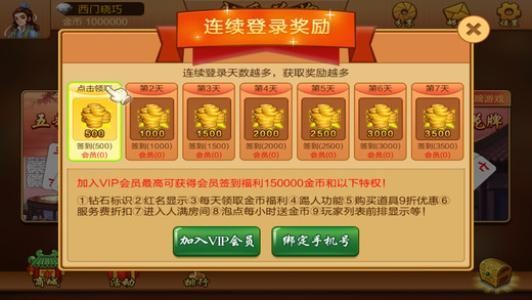 4、登錄有獎-在線領獎:眾多獎勵將伴隨您的成長,不管是登錄,在線或隨便打幾局牌,就有大量金幣送給您。