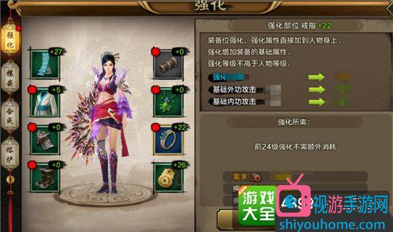 強(qiáng)化系統(tǒng)在游戲前期也是個(gè)提升戰(zhàn)斗力的好途徑,強(qiáng)化系統(tǒng)就是對(duì)裝備的位置進(jìn)行基本屬性強(qiáng)化,強(qiáng)化屬性直接加到任務(wù)身上,強(qiáng)化是增加裝備的基本屬性,強(qiáng)化等級(jí)不能高于人物等級(jí),強(qiáng)化到20多級(jí)是非常簡單的,只需要消耗一些錢幣。