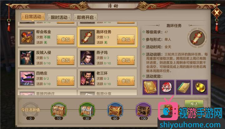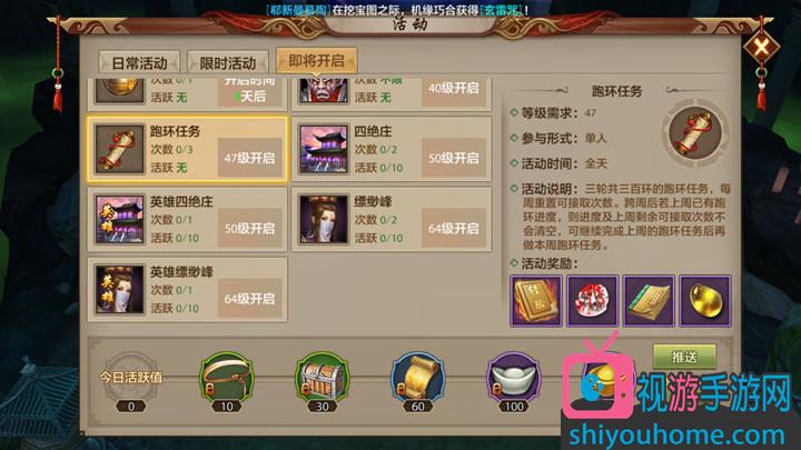 等級在47級(≥47級)就可以參加跑環的任務,時間非常靈活,每天的任何時間段都可以開始任務,所以各位大俠可以自行安排任務的時間。