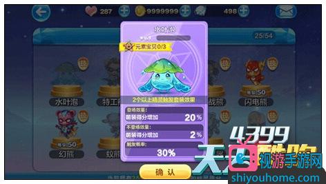 再說水葉泡的搭配之前,水葉泡擁有的效果還是需要說下的,水葉泡是元素寶物之一,登場效果萌裝得分增加20%,不登場得分加2%,在1級時觸發幾率為30%。