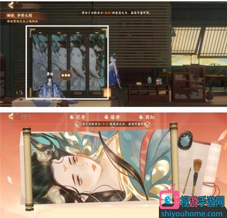 用茜紅顏料/花青顏料/藤黃顏料:給左側(cè)屏風(fēng)上色