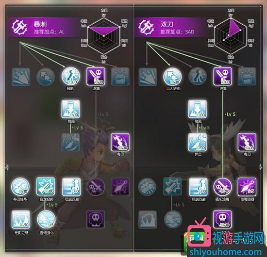 在游戲中刺客(盜賊)的戰斗能力很強,同時花樣繁多。可以利用高攻速和高閃避來持續的輸出,也可以進行隱身然后通過高爆發的技能給予致命的傷害,同時還能發出毒素,給予毒屬性額外傷害不斷的掉血。這里主要給大家推薦兩個加點方案: