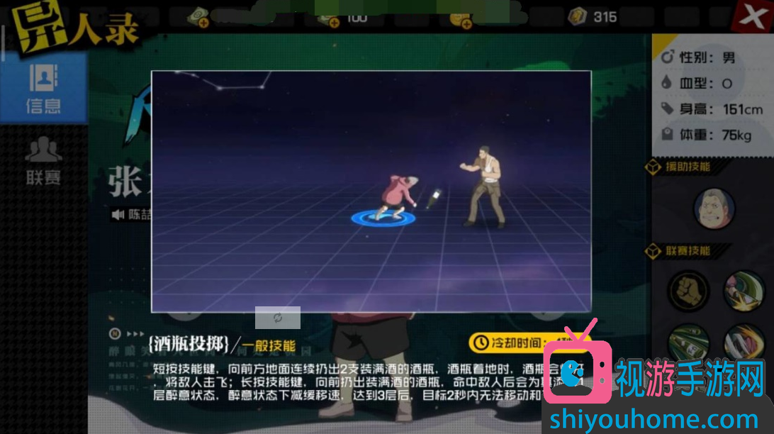 酒瓶投擲為一般技能,擁有兩種攻擊模式。其中,短按技能鍵可以投擲兩支裝滿酒的酒瓶,著地后將處于攻擊范圍的對手擊飛,而長按技能鍵則是扔出一個酒瓶,命中對手后自身得到一層醉意狀態,醉意狀態下減緩移速,達到3層后目標將在接下來的2秒時間內無法攻擊和移動。注意,短按技能鍵更靈活,不易被目標反制;長按技能鍵若不能確保命中,自身則有可能被對手打出一套連招,應根據戰況選擇性使用。