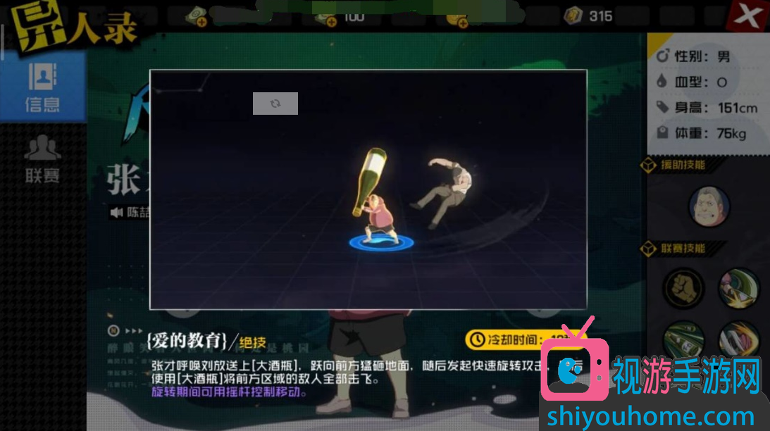 愛的教育是張才的絕技,通過劉放贈與的大酒瓶,可以跳躍至目標身旁并砸下,造成傷害和擊飛效果。同時,張才后續會旋轉大酒瓶對目標實施進一步的壓制,并能旋轉攻擊結束后擊飛目標,傷害爆炸,極為可怕。注意,該技能施法距離較短,一定要做好距離的把握,以免空大。