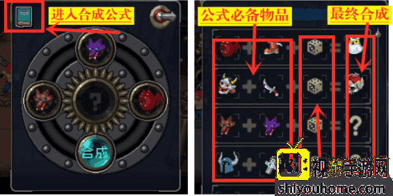 在關卡中會出現合成爐,合成爐中有合成方法,合成一次才會知道合成的道具效果(這休閑鞋道具在商人和副本中是獲取不到的,需要特定的道具來進行合成),合成公式中顯示必備的道具為必須物品,骰子為添加隨機道具即可。圖鑒合成均為稀有道具,不按照圖鑒中合成基本都是垃圾道具。